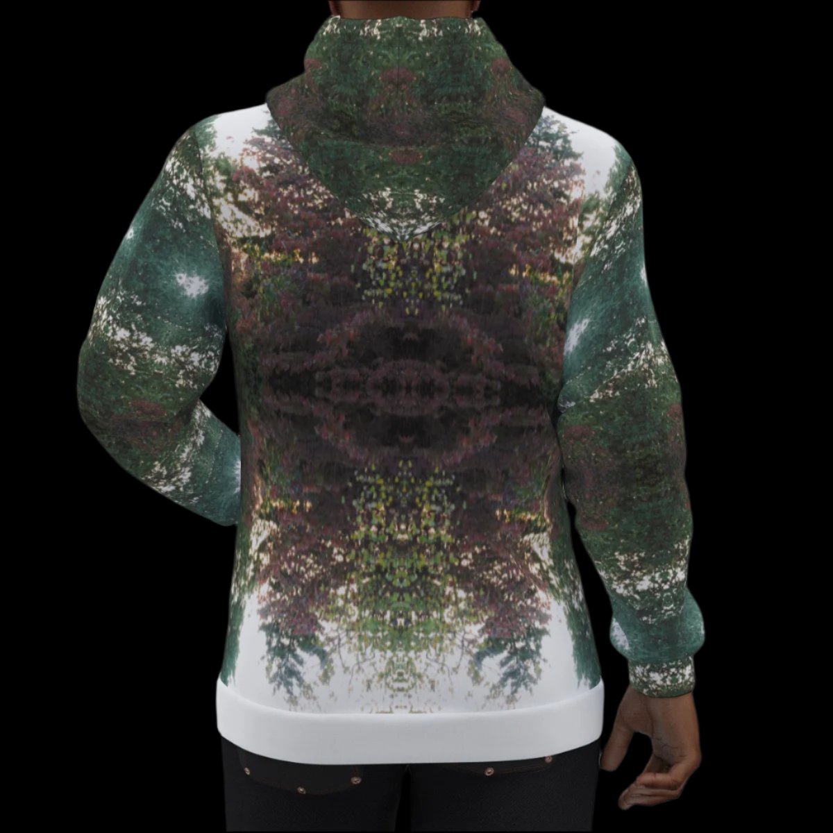 - White drawstring, front pocket and black inner hood