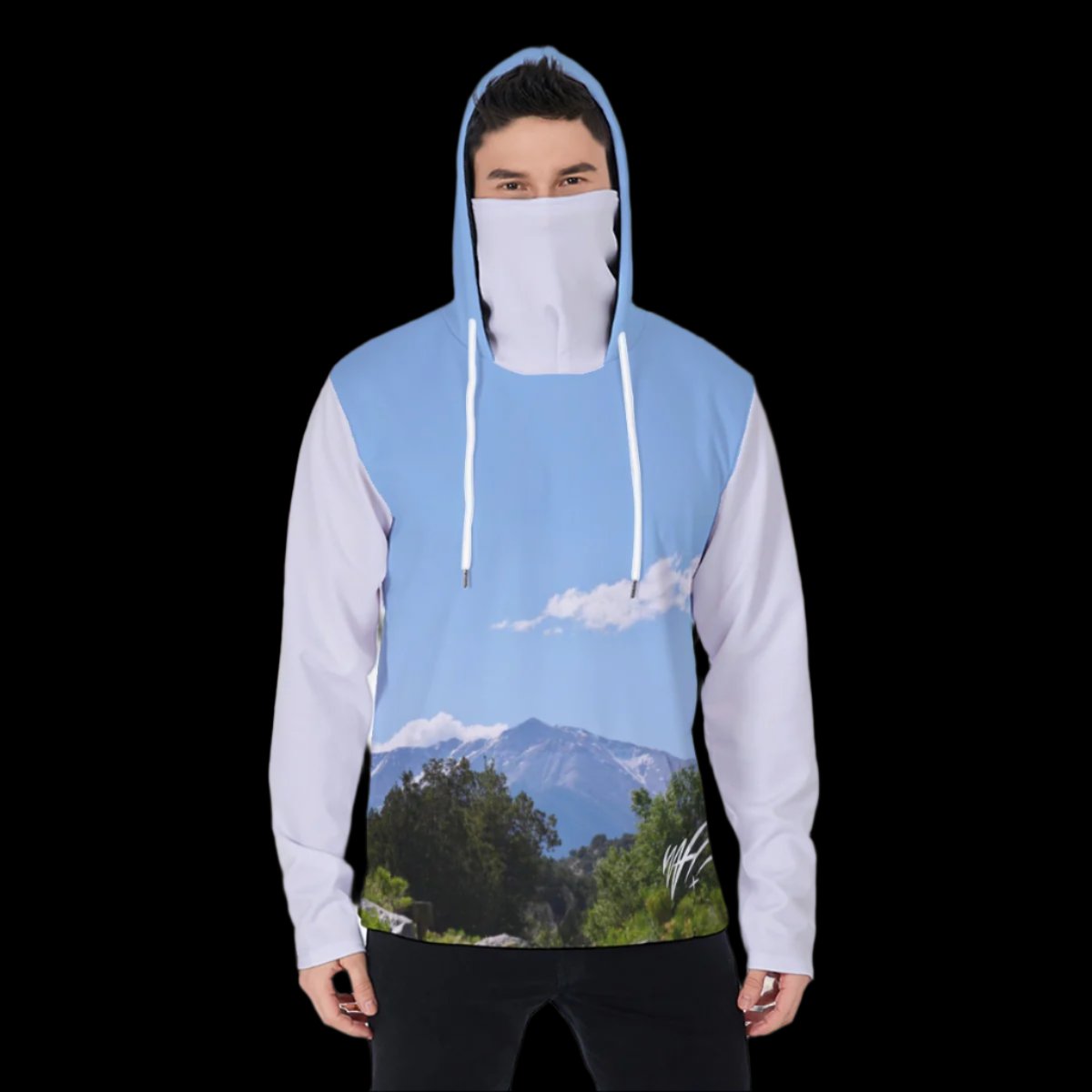 - Masked design, hood, drawstring, kangaroo pocket.